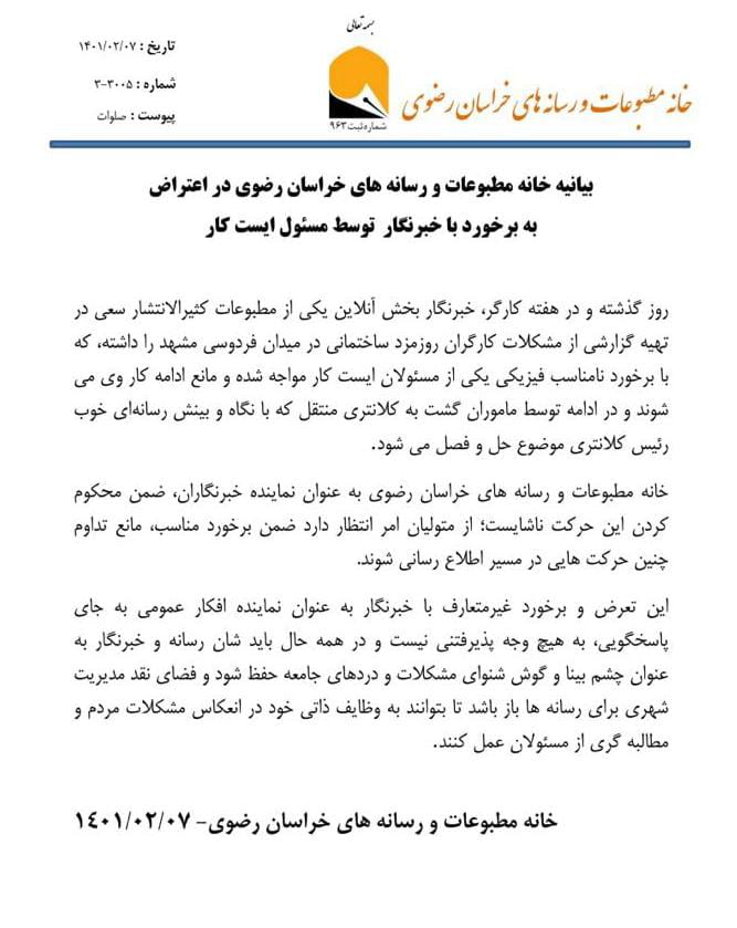 بیانیه خانه مطبوعات و رسانه های خراسان رضوی در اعتراض به برخورد با خبرنگار توسط مسئول ایست کار