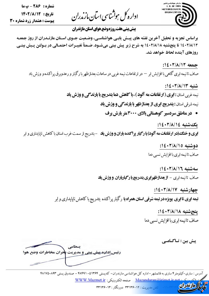 بر اساس این گزارش ، مدیرکل هواشناسی مازندران در گفت و گویی اظهار داشت: