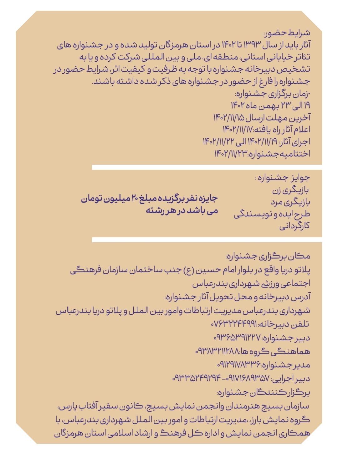به گزارش تابناک هرمزگان،کانون تبلیغاتی سفیر آفتاب پارس ، سازمان بسیج هنرمندان ،انجمن نمایش بسیج استان هرمزگان ، گروه تئاتر بارز و مدیریت ارتباطات و امور بین الملل شهرداری بندرعباس با همکاری اداره کل فرهنگ و ارشاد اسلامی و انجمن نمایش استان برگزار می نمایند .