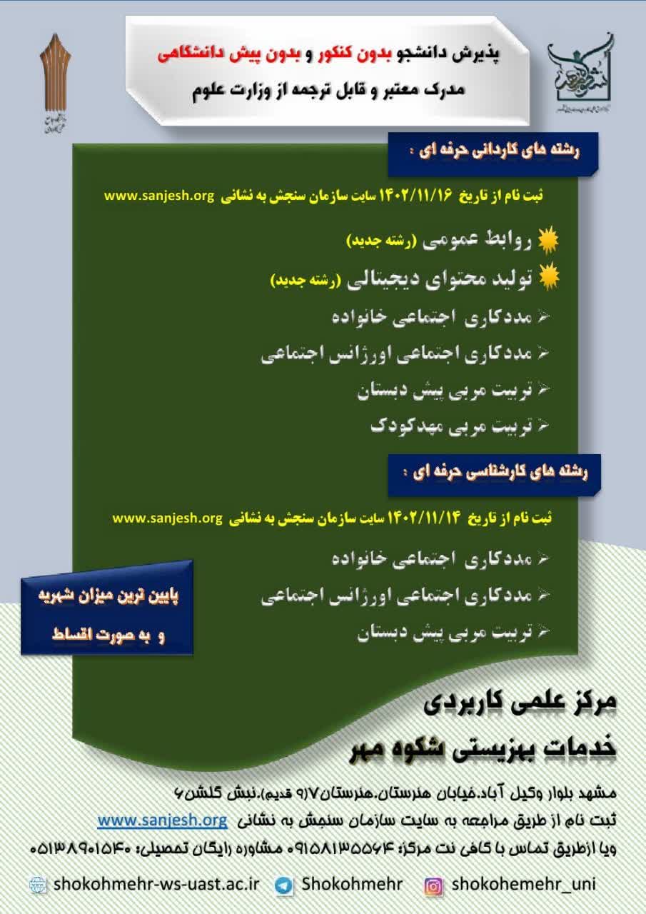 شایان ذکر است دانشجویان و علاقمندان به تحصیل در این دانشگاه برای تحصیل در مقطع کاردانی تا پایان وقت اداری ۱۸ بمهمن و در مقطع کارشناسی تا پایان وقت اداری ۲۰ بهمن ماه می توانند به نشانی بلوار وکیل آباد، خیابان هنرستان 7، نبش گلشن 6 و شماره تماس 38645548مراجعه نمایند.